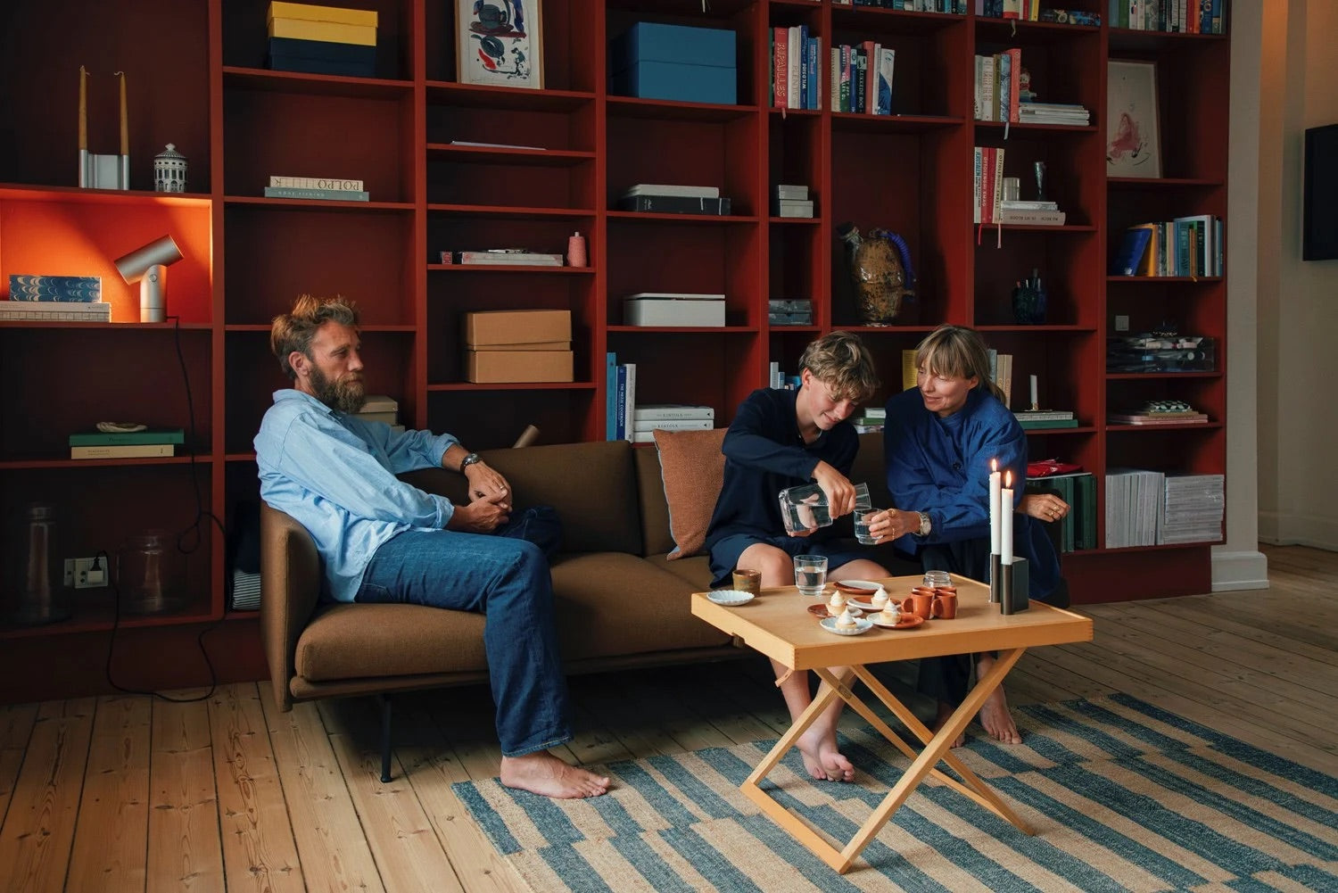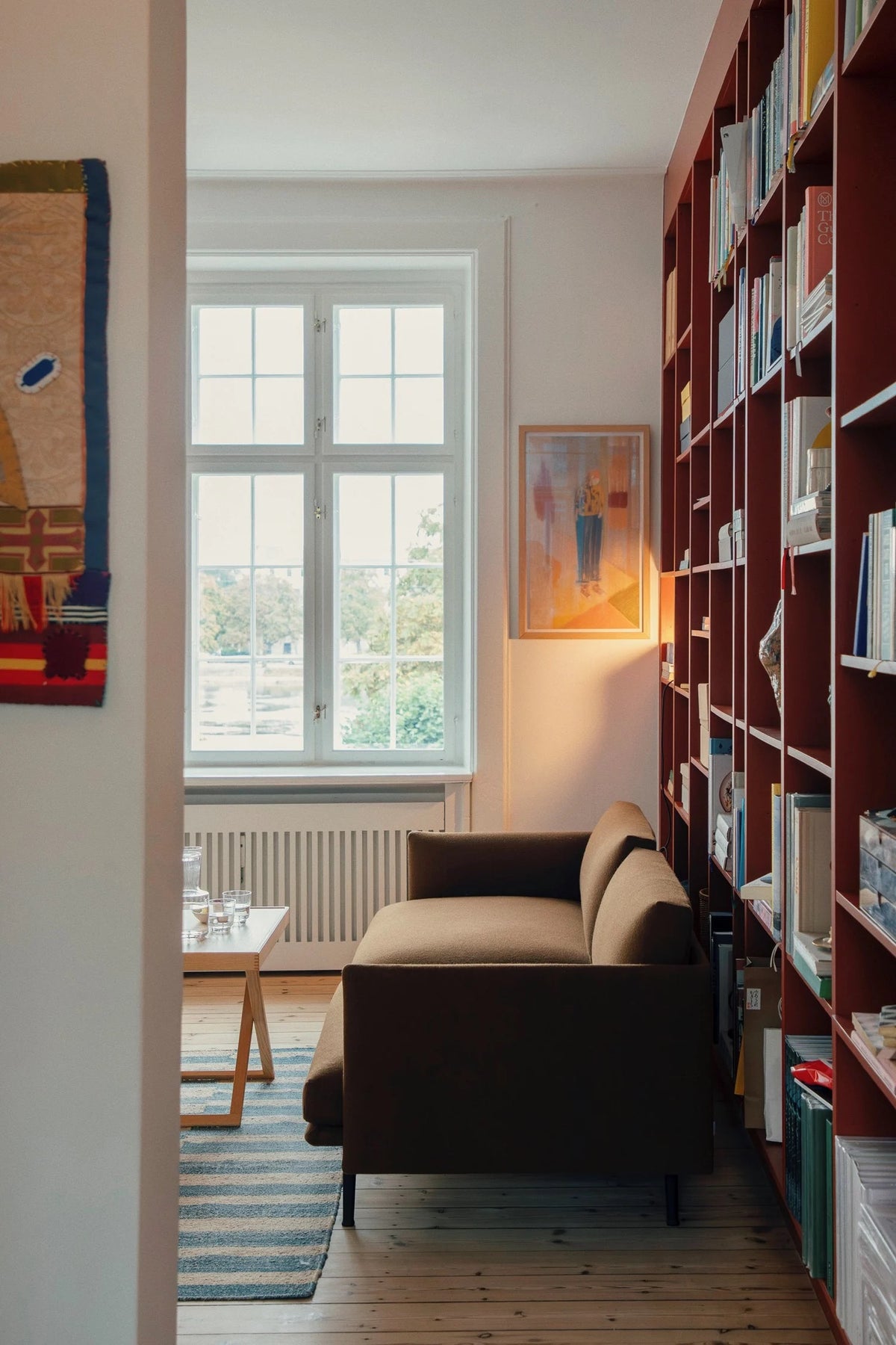 Mikkel: We have a lot of art and colour in the home, so we try to balance that with furniture that feels timeless and grounded. This sofa does that—it’s big enough for us to really use it, but simple in its shape and proportions. The color also works perfectly with the bookshelf behind it, which we actually painted red not long ago. That small change made a big difference.