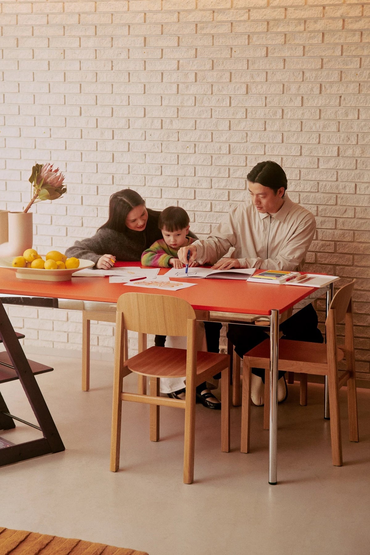 The world outdoors is important for Wai Tsui, the founder of Hiking Patrol. So, two years ago, when he, his partner Adeline Hermier, and their baby son Lian were looking for a new home, they were immediately drawn to a modernist concrete house a stone’s throw from Oslo, Norway. From its open terrace, large windows, and garden backing onto the forest, the Norwegian creative can go running in the mountains, take his son sledding in the snow, or simply sit around the fire playing with Lego in the central living space. It’s a happy intersection of indoors and outdoors.