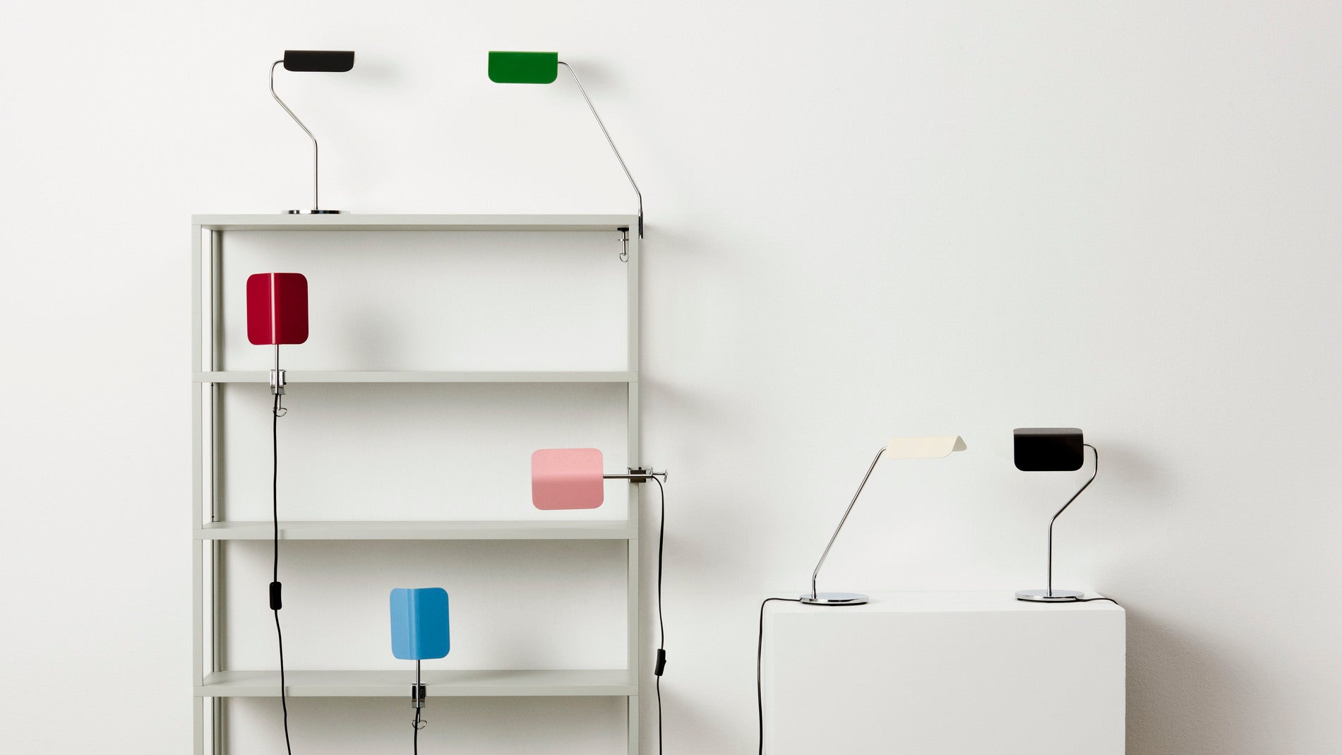 Taking cues from the classic Banker’s Light, British designer John Tree merged archetypal references with his contemporary, colourful sensibility to create the Apex Lamp collection. The folded steel shades create a peaked roofline silhouette, providing the inspiration behind the series’ name as well as offering a graphic contrast to the chrome-plated bases. The colourful steel shade rotates 360 degrees, allowing users to direct light to suit their needs.