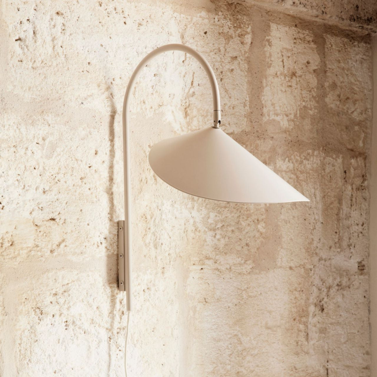 The Arum Swivel Wall Lamp is characterised by an organic shape that is elegantly suspended from a curved metal arch in a leaf-like manner. With the matte, off-white inside of the shade, the lamp provides a soft, evenly distributed light. The arm of the lamp includes a swivel mount, allowing the lamp to turn in all directions, ensuring that the Arum Swivel Wall Lamp will provide optimal light in every situation. The lamp includes a fabric cord with a switch and comes with a wall bracket, making it is easy to mount the Arum Swivel Wall Lamp on your desired wall.