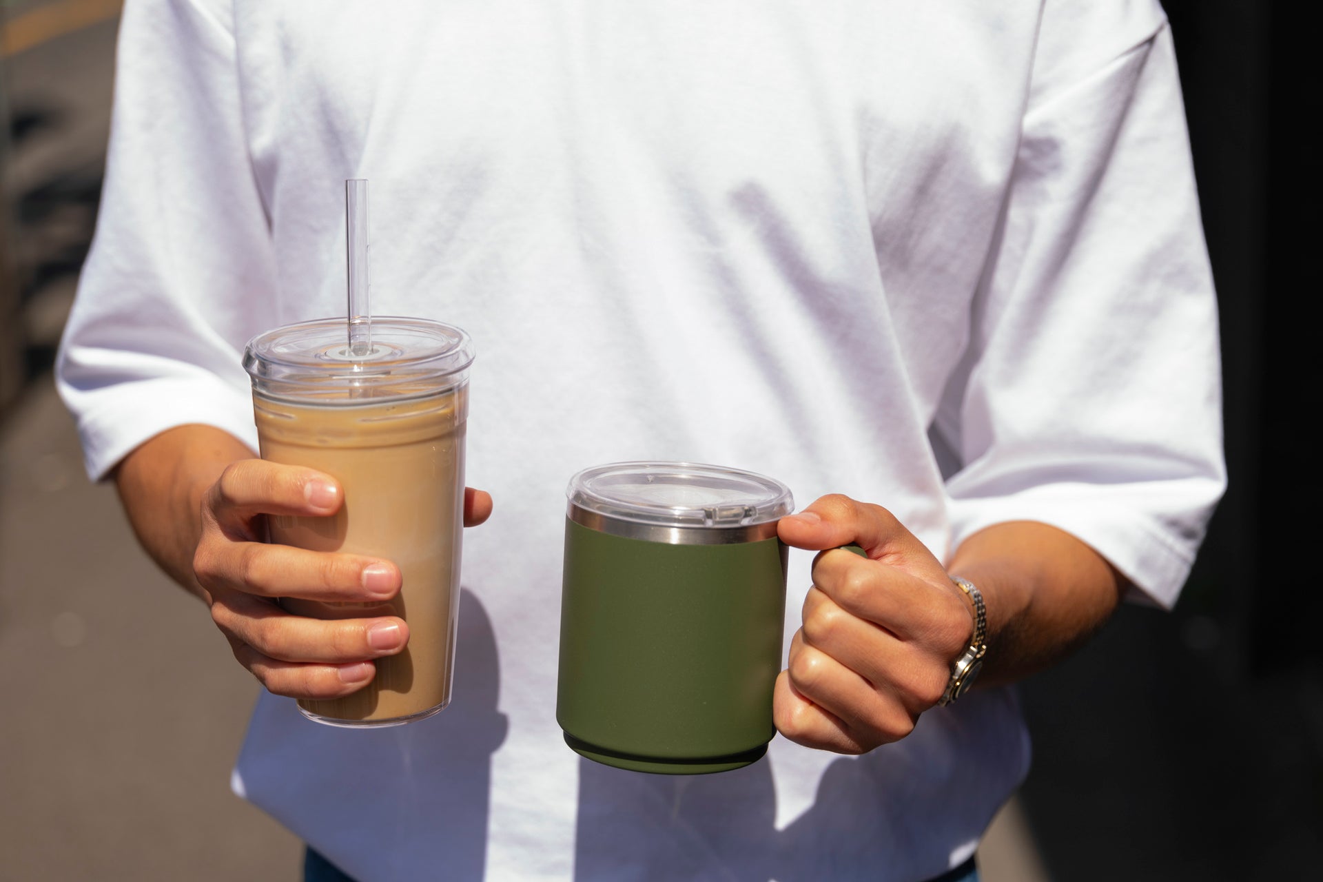 Recycled content: 90% recycled steel cup, 50% Tritan Renew clear plastic lid.