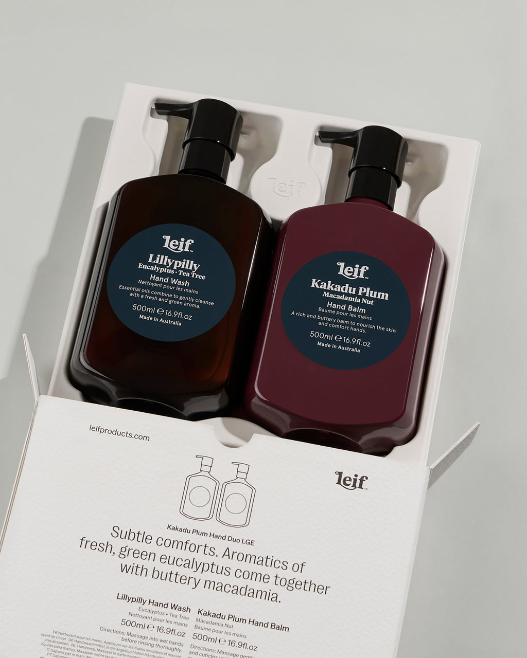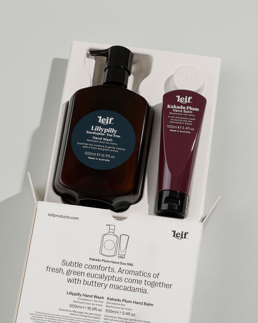 This gift set ties together Lillypilly Hand Wash (500ml) & Kakadu Plum Hand Balm (100ml or 500ml), abundant in Vitamin C to cleanse and comfort hands. Presented in a beautifully minimalist, recyclable box featuring FSC-certified materials.
