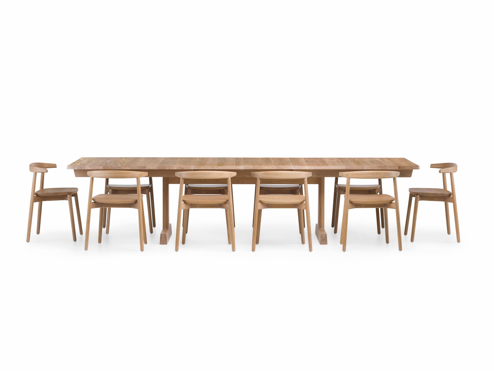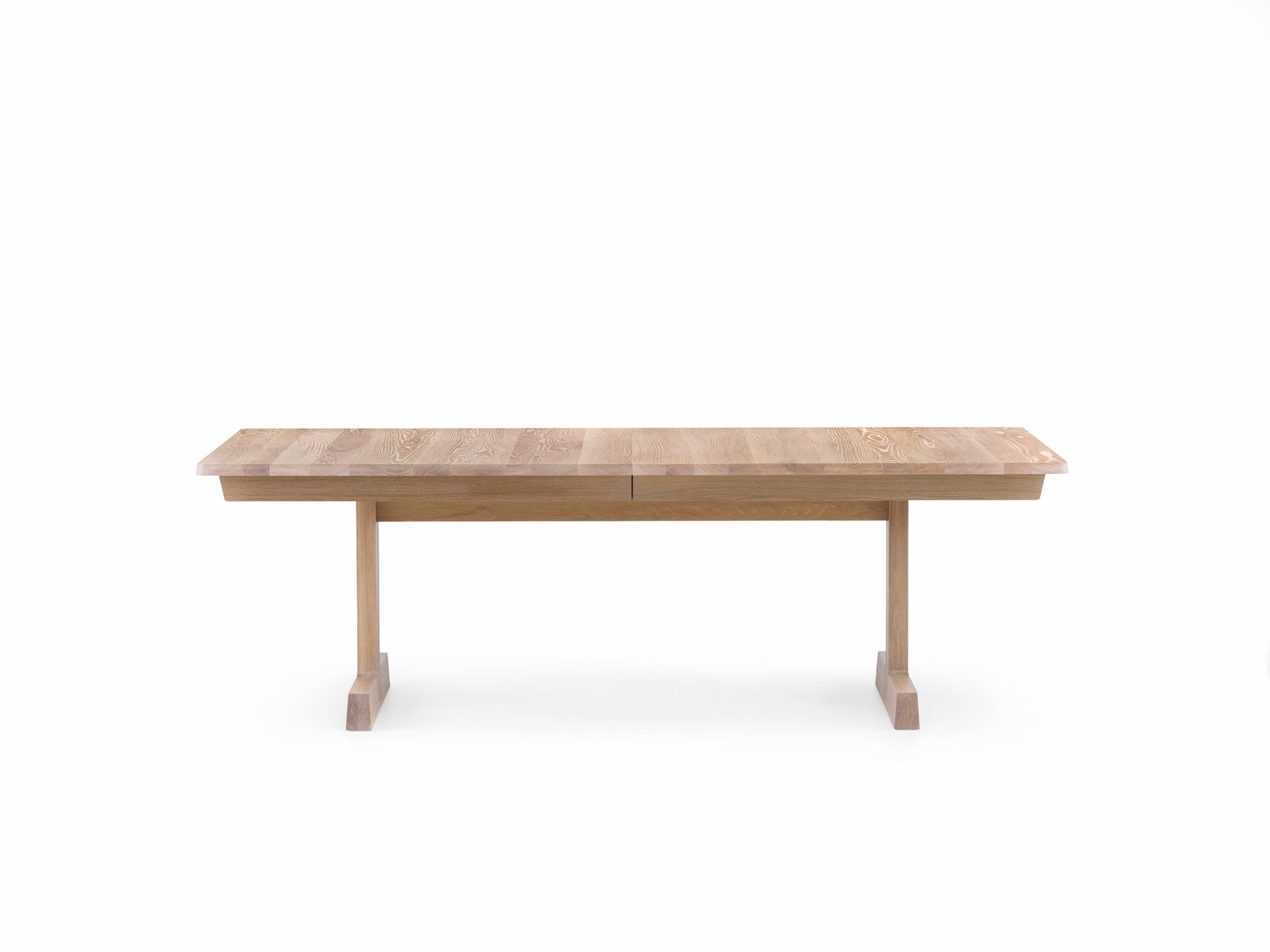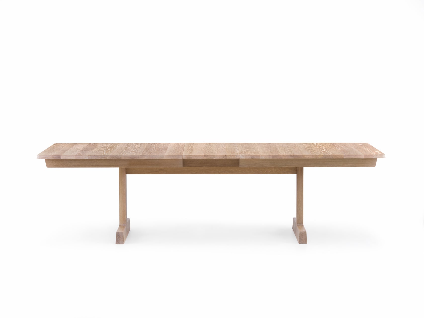 Refectory is a monastic, utilitarian, and robust extending table with a pragmatic, functional design that embraces the passage of time. A very tough yet elegant table in solid timber. Rather than conventional extension mechanisms, the table makes innovative use of linear guides - normally used for accurate and smooth movement of machine components - enabling quiet, maintenance-free operation. With two extension leaves, the table extends to three possible lengths. The solid wood extension leaves are stored in a fabric-lined compartment within the tabletop when not in use.