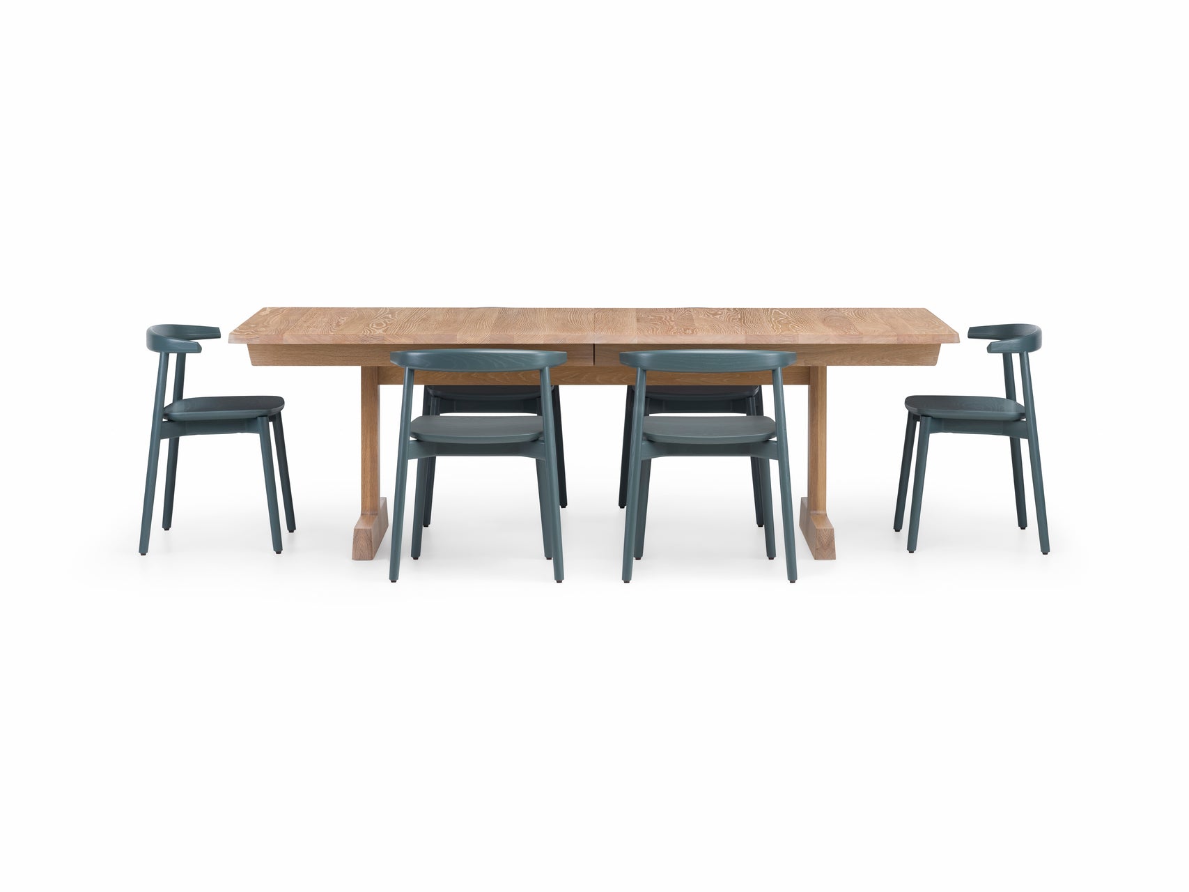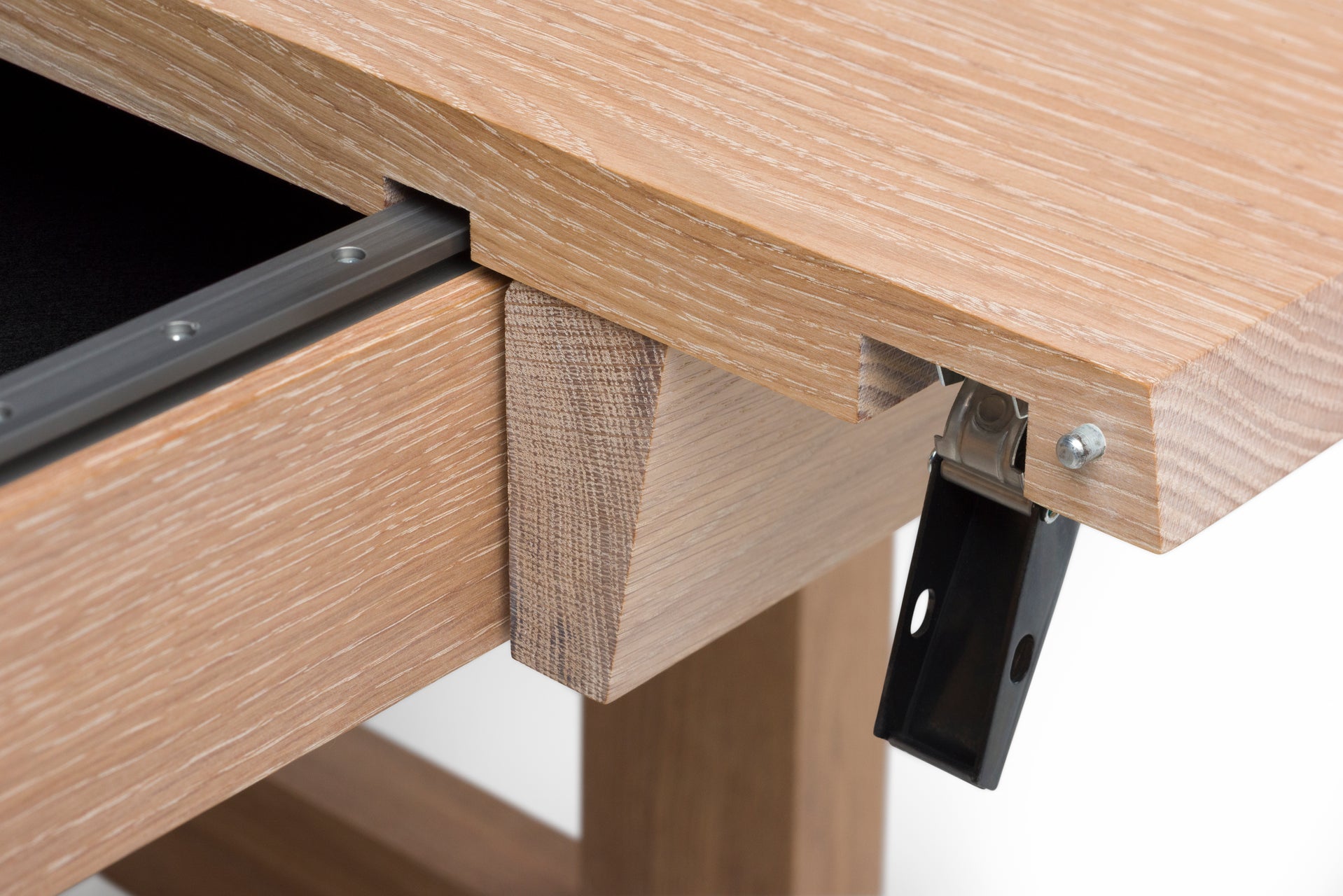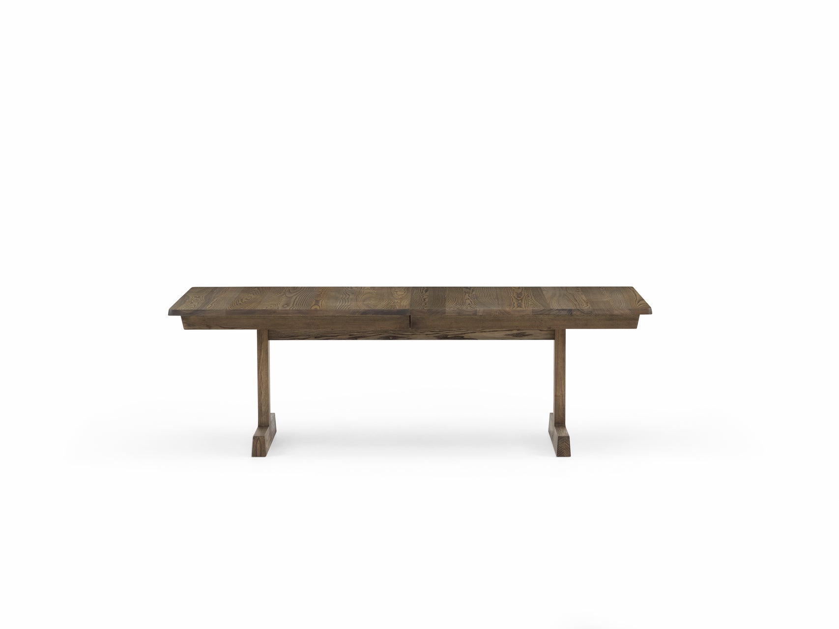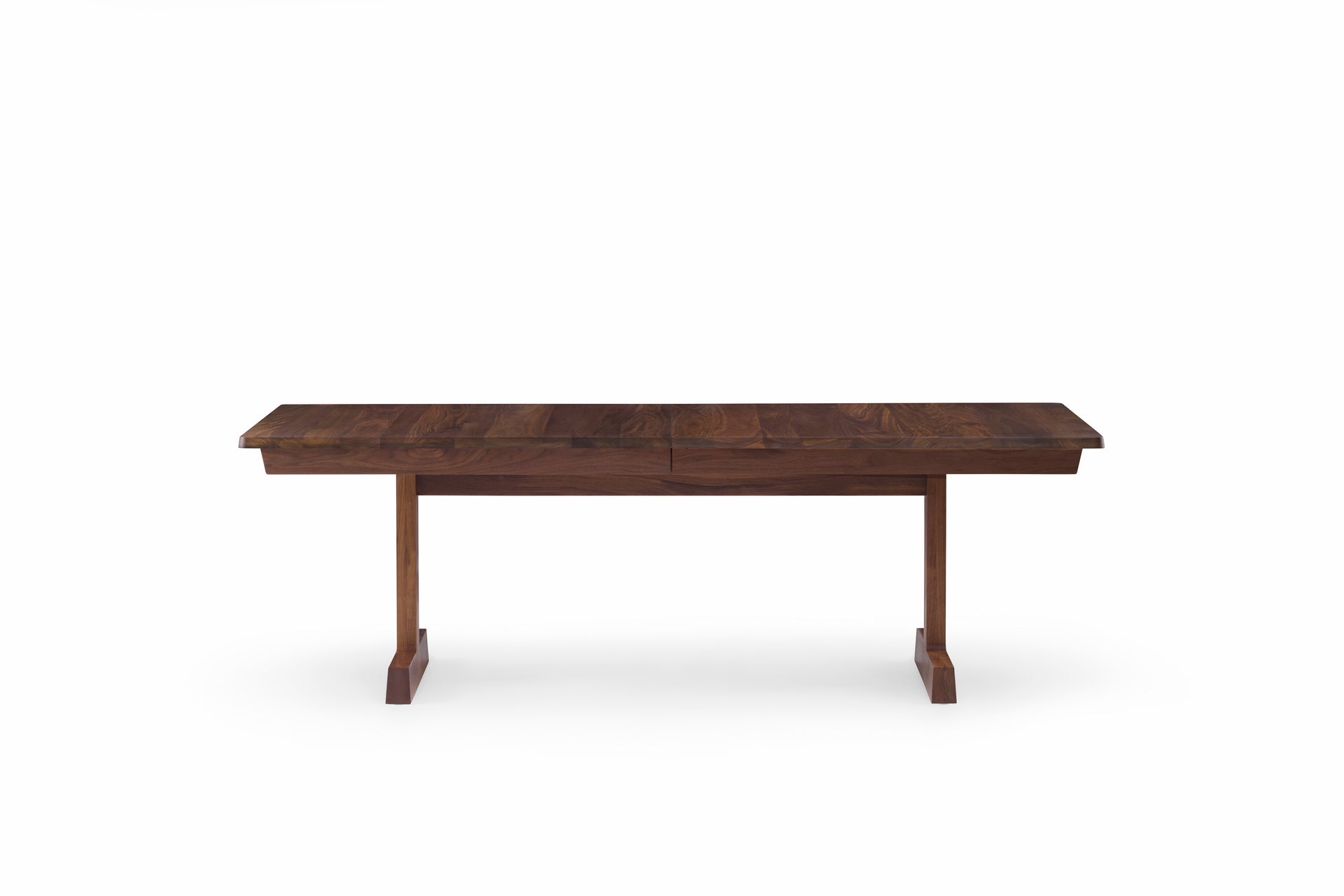 Refectory is a monastic, utilitarian, and robust extending table with a pragmatic, functional design that embraces the passage of time. A very tough yet elegant table in solid timber. Rather than conventional extension mechanisms, the table makes innovative use of linear guides - normally used for accurate and smooth movement of machine components - enabling quiet, maintenance-free operation. With two extension leaves, the table extends to three possible lengths. The solid wood extension leaves are stored in a fabric-lined compartment within the tabletop when not in use.