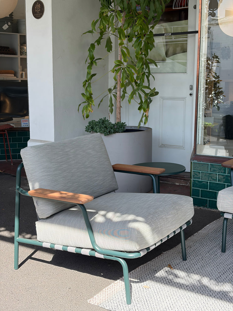 Bent steel tubes, steel rods, and steel plates. The frame is electro-galvanised, primed, and powder-coated available in Dark Green, Taupe or Grey. Armrests are made from FSC™-certified (FSC-C028824) sapele mahogany wood. The webbing is made of 72% PP (Polypropylene) and 28% Rubber.
