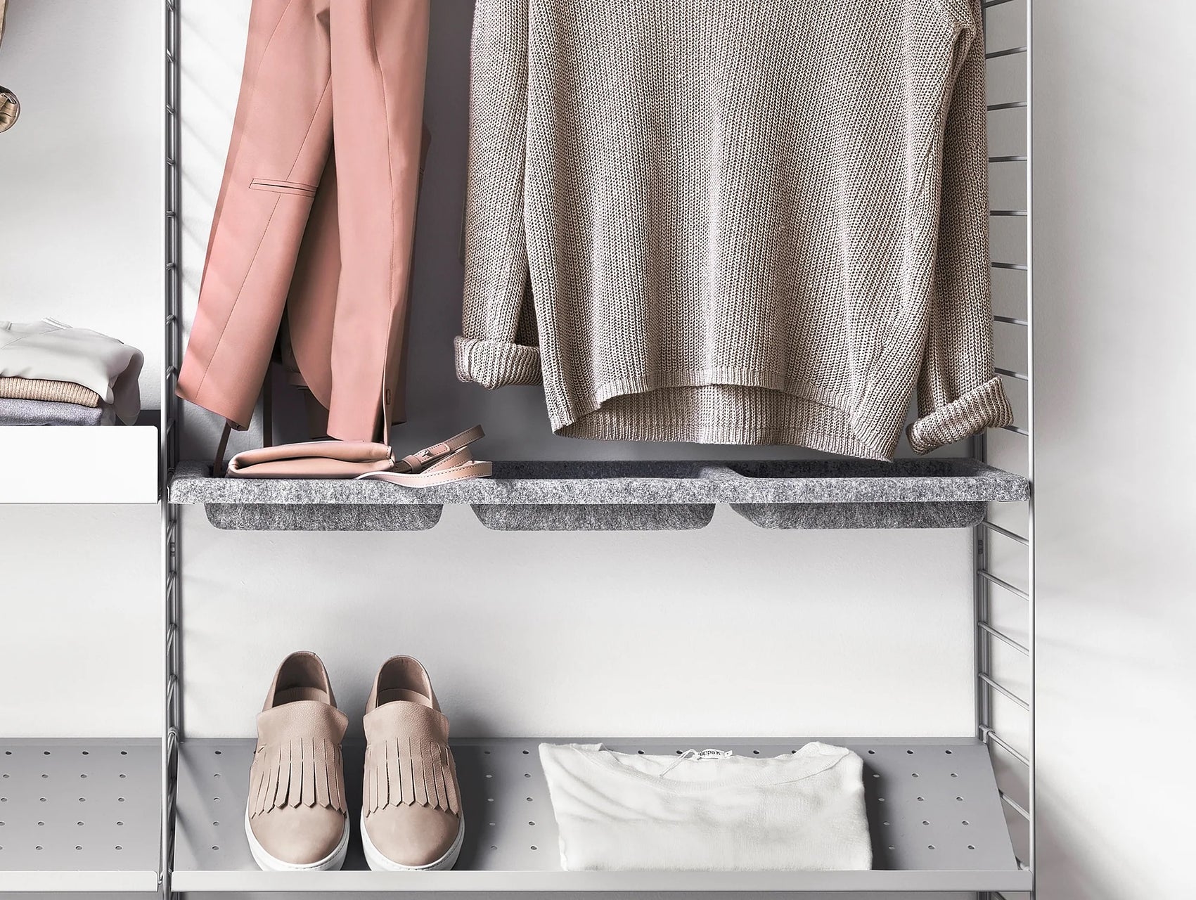 The String® System Bowl Shelf is available in one width, 78 cm, and one depth, 30 cm. The bowl shelf fits into all 30 cm deep wire panels from String® System. By adding a bowl shelf to your shelving combination, you instantly add a given spot for all those things you do not really know where to place. The bowl shelf will help you to keep order in both your hallway and kitchen.