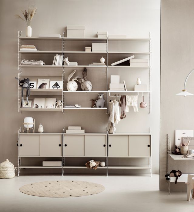 The String® System Floor Panels are available in three heights, 85 cm, 115 cm, 200 cm with one depth, 30 cm. The panels are the base when building your string shelf. When the panels are decided you can start adding products from String® System. Choose among shelves, cabinets, drawers, and more. The foot of the floor panel rests against the floor which makes the shelf stable while appearing light and airy.
