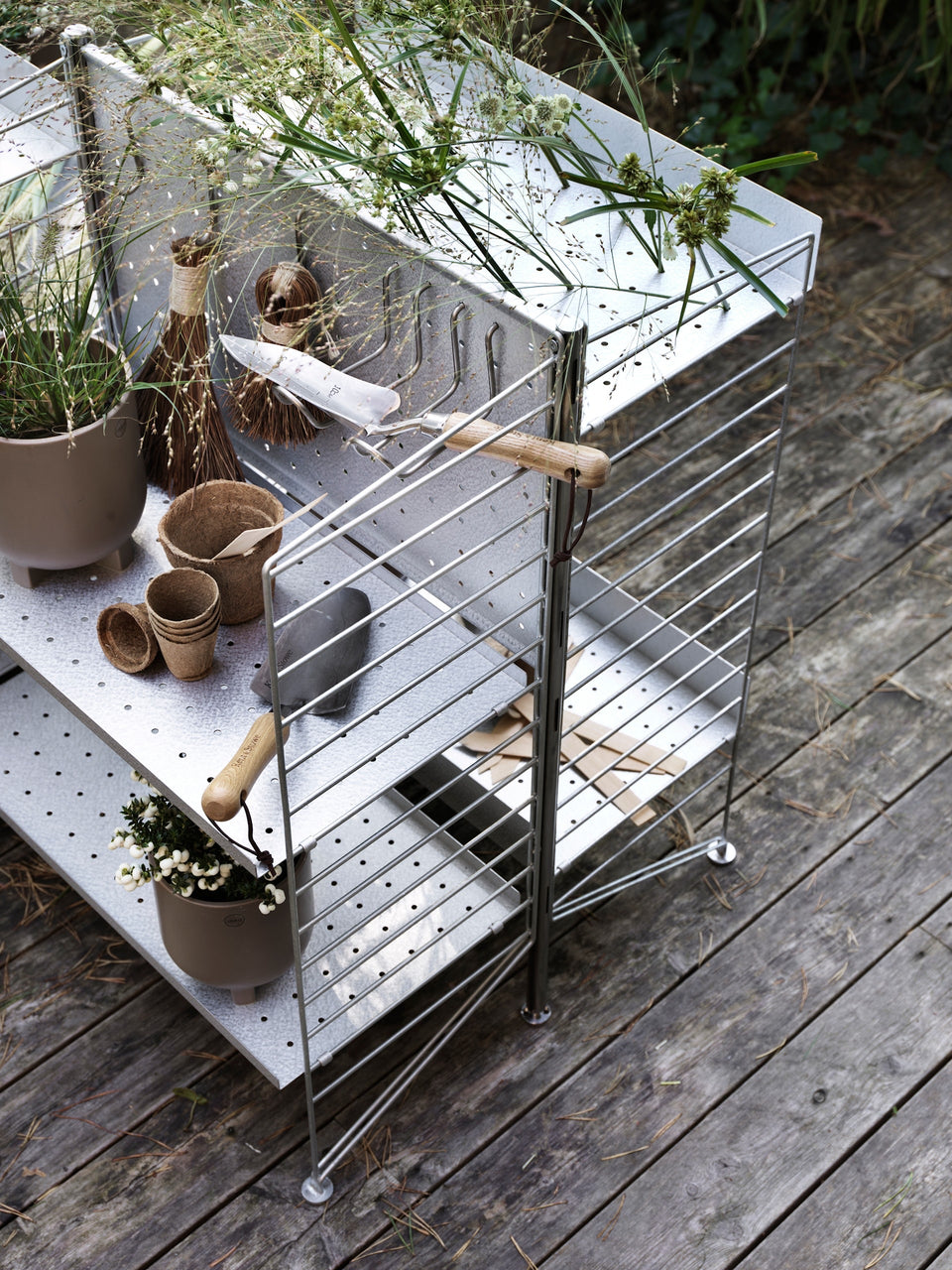 The String® System Outdoor Upright is part of the free standing outdoor shelf and is made of galvanised steel. A complete section of the free standing shelf consists of one back panel, two uprights and two galvanised floor panels. To build additional sections, you need one upright along with one panel for each section. We recommend at least one back panel, preferably placed in the middle, for a free standing shelf consisting of three sections.