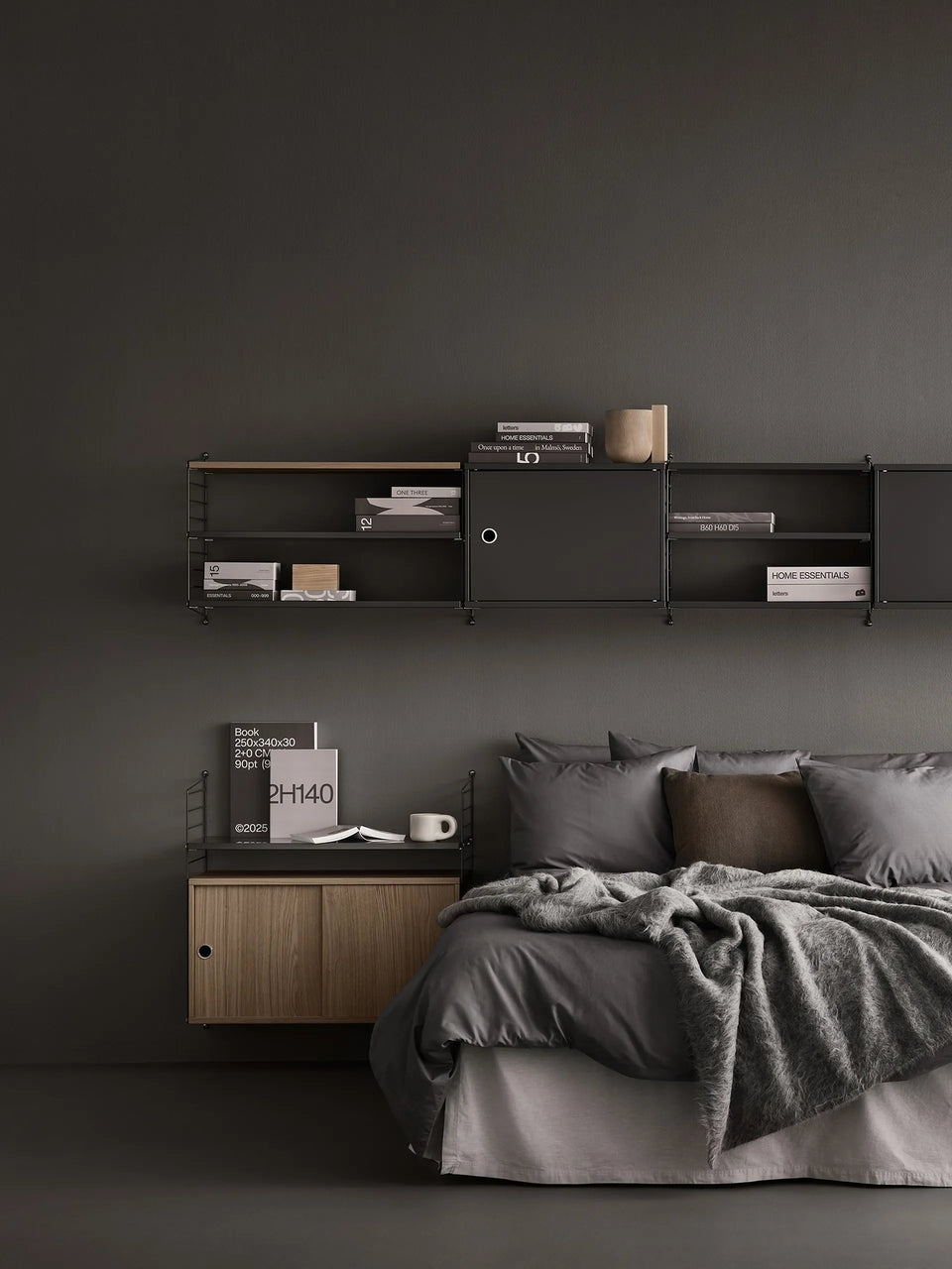 The String storage systems are multi award winning designs that continue to grow in strength; a light weight and flexible storage system constructed of side panels and shelves that are easy to mount and move creating various combinations, depths, and frame functions as a unit.